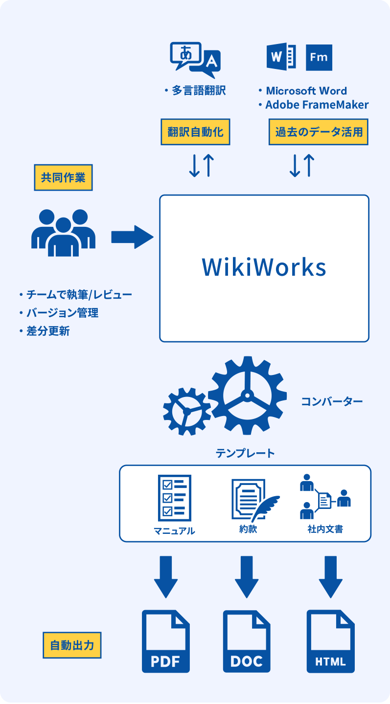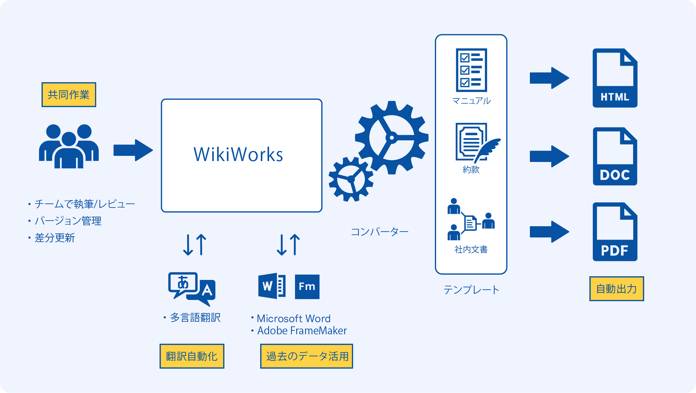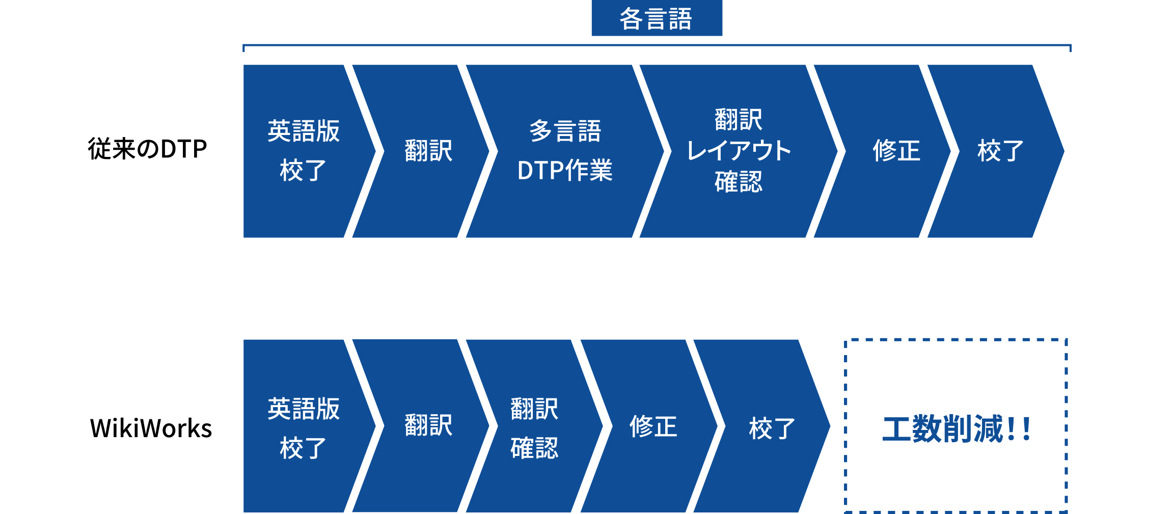 従来はベース言語を作成し、ターゲット言語を翻訳、DTP作業、チェック、修正などを各言語ごとに行っておりましたが、WikiWorksでは翻訳ツールとの連動やテンプレート活用によるレイアウト作業自動化を行い複数の言語を同時に自動で作成することが可能です。