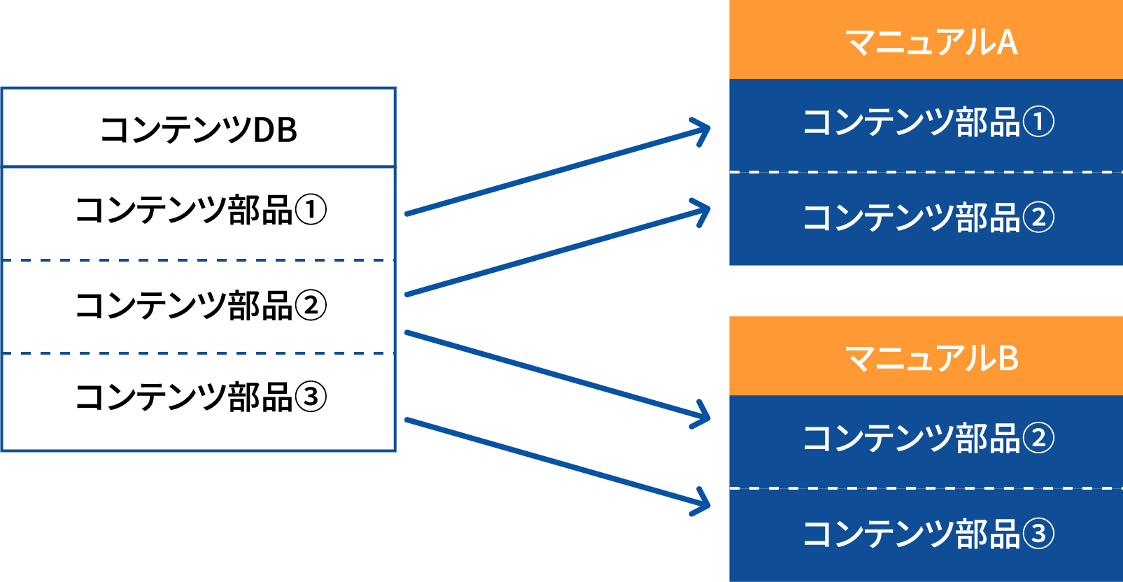 マニュアルで使用する記述を、章、節、項などの単位で部品化して管理します。部品を組み合わせて多種のマニュアルを作成することにより、データの流通率を上げ、作業の効率化が実現します。